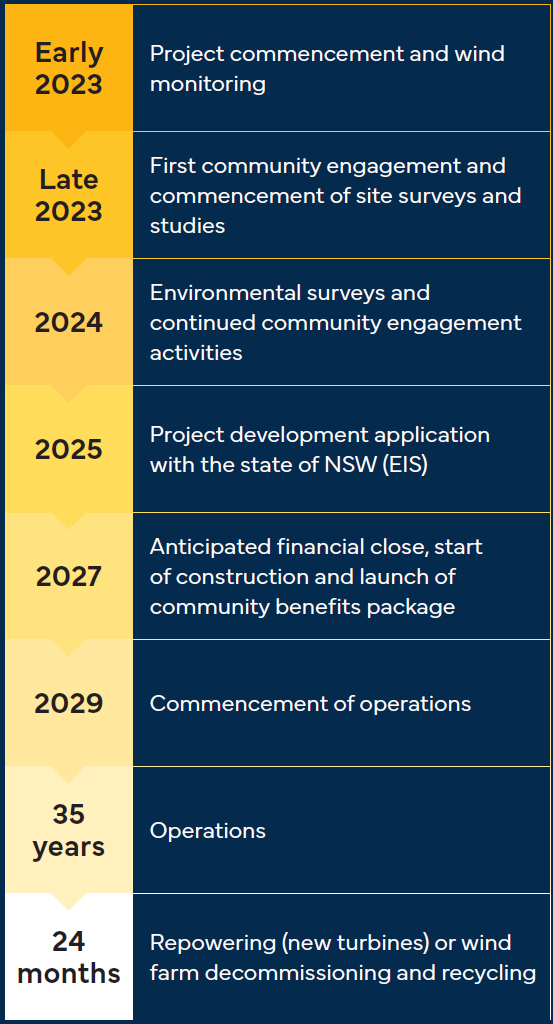 Construction of the Devlins Bridge Wind Farm is expected to take about two - three years to complete and is expected to commence in late 2027, subject to project approvals.